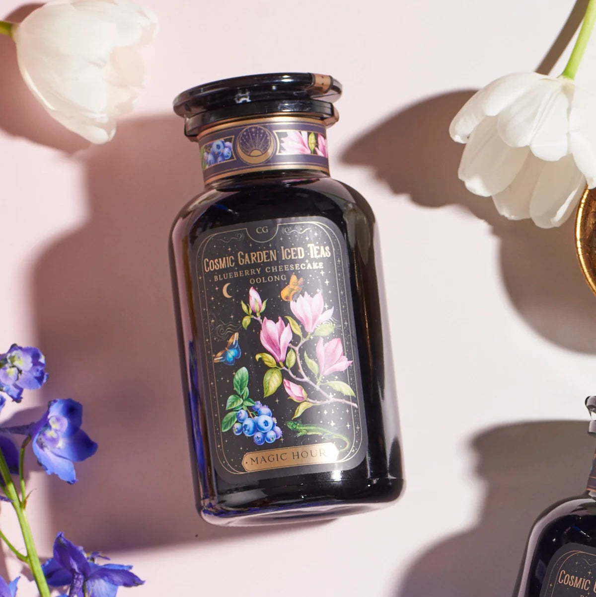 Organic Sencha Green Tea, Organic Ti Quan Yin Oolong, Organic Blueberries, Butterfly Pea Flower, Organic Madagascar Vanilla Beans, Natural Blueberry Extract*, Natural flavors*