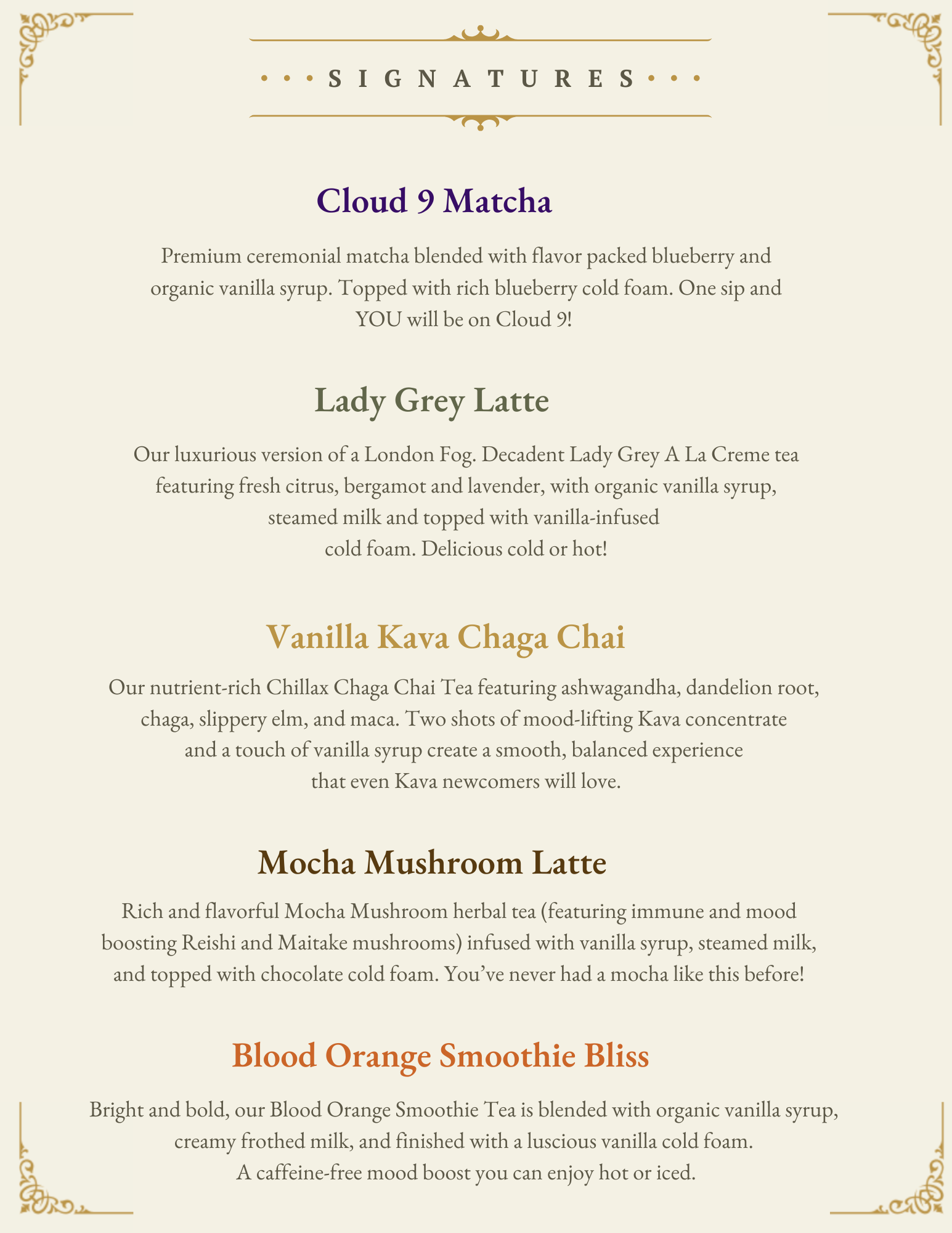 Whether you’re here for a calming cup of herbal tea, an energizing matcha latte, or one of our seasonal specialties, each beverage is crafted with care.
