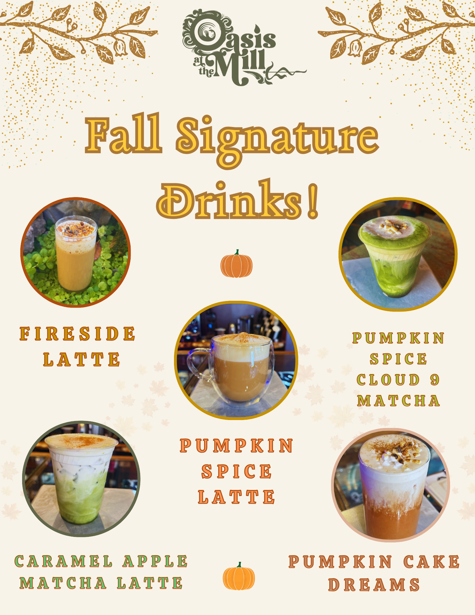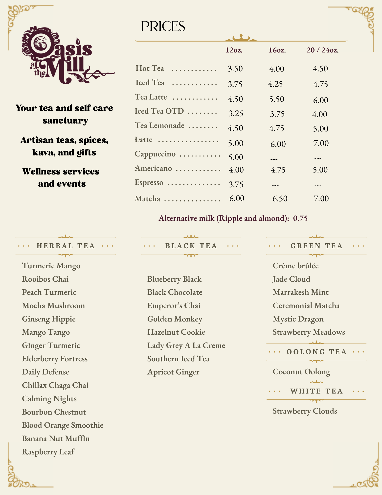 Our café menu at Oasis at the Mill blends traditional tea culture with modern wellness-inspired drinks.